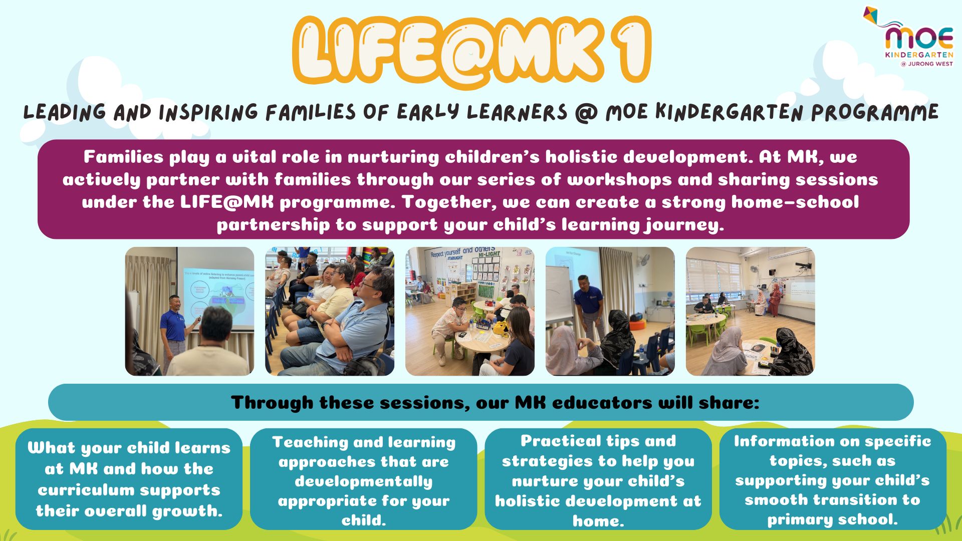 Families play an important role in nurturing childrenās holistic development. We routinely involve families in childrenās learning through our series of workshops and sharing sessions under the LIFE@MK programme.